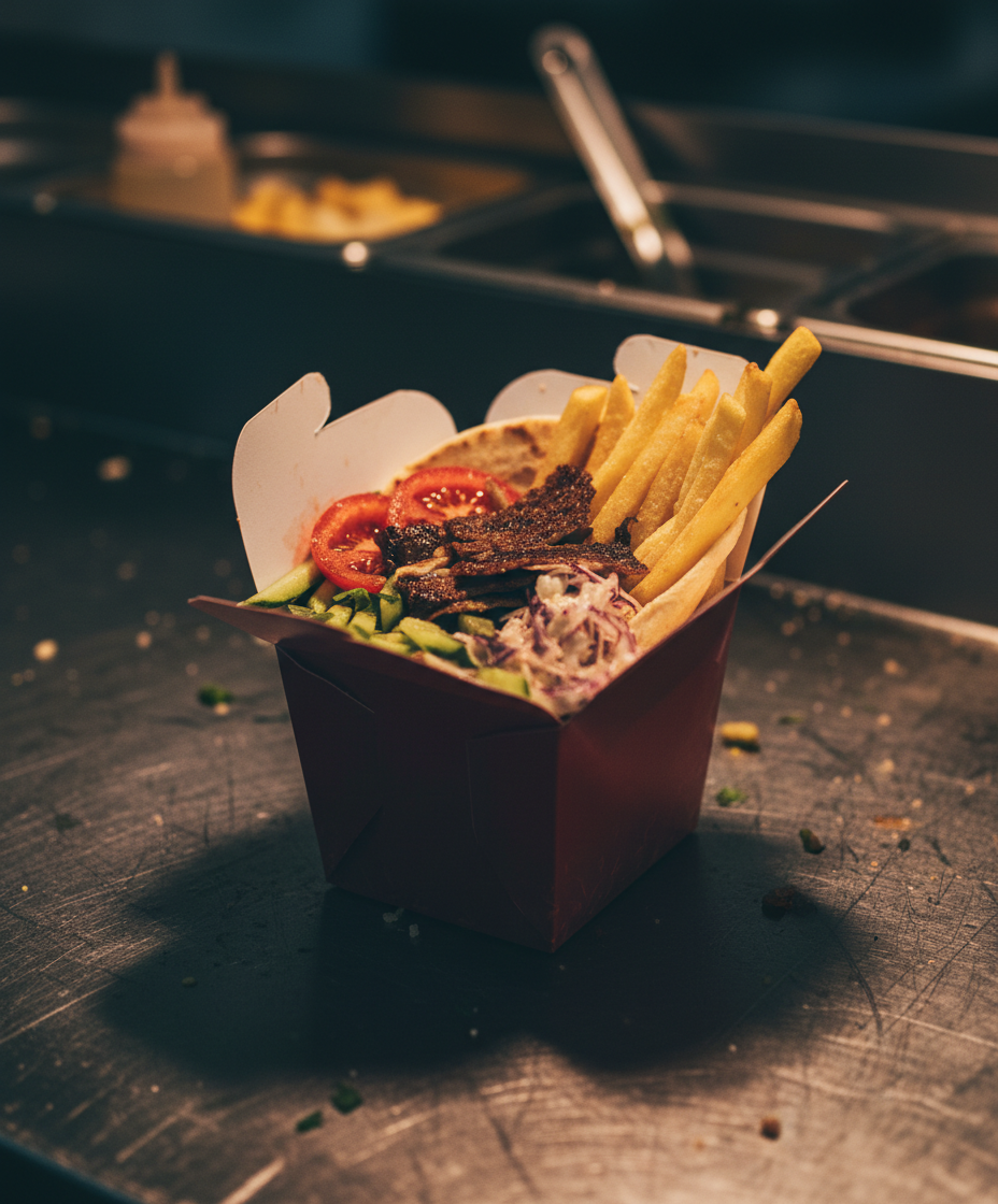mit Pommes und Soße oder Salat und Soße oder mit Reis und Soße1,2,8